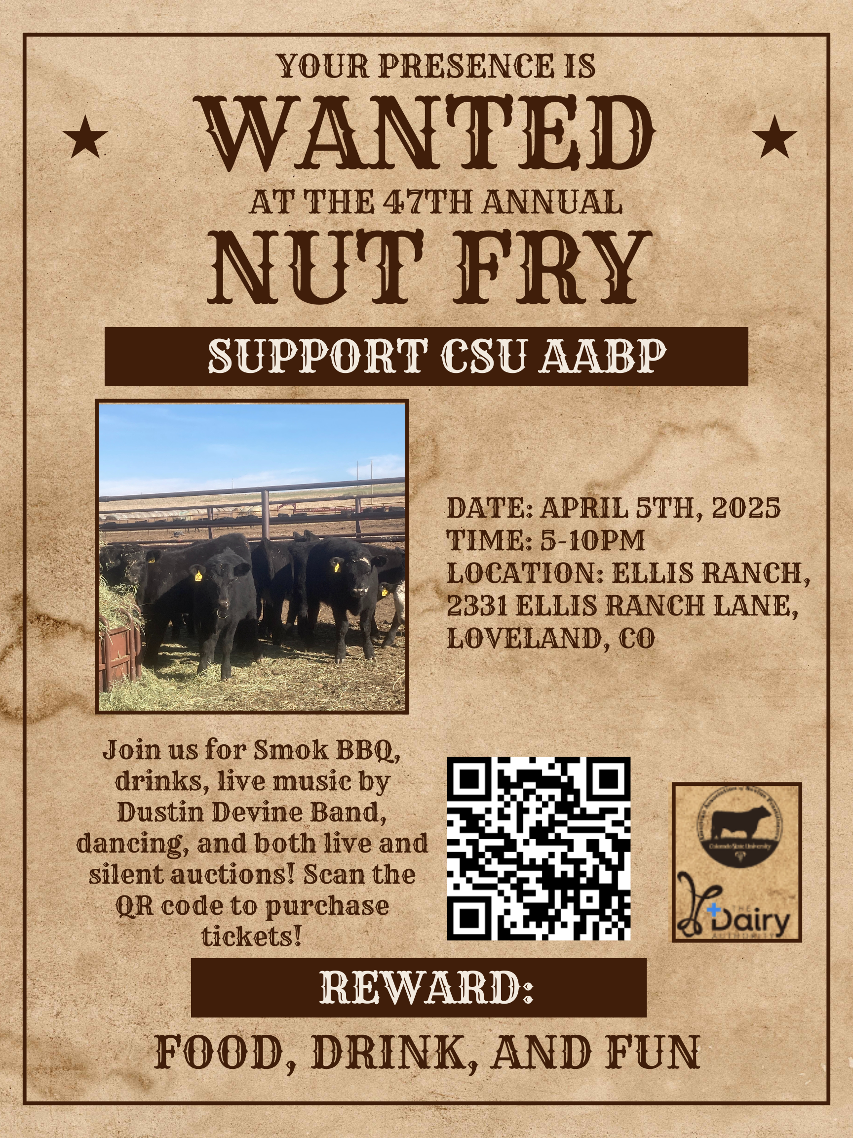 TICKETS ARE NOW ON SALE! Grab them while you can we are expecting a big crowd! We hope to see you at the 47th Annual Nut Fry! By popular demand we will be returning to Ellis Ranch for a dinner from Smok barbecue , drinks, dancing, a silent and live auction. Tickets get you all these things plus an entry into our raffle! Follow the QR code below or go to https://csu-aabp.checkoutpage.co/csu-aabp-nut-fry to purchase tickets!
